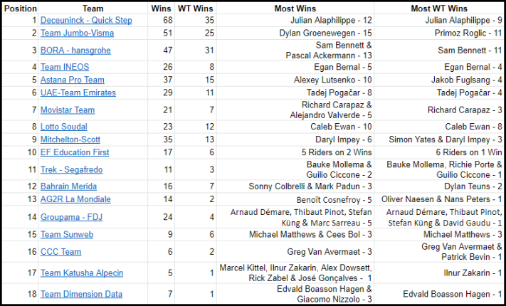 In the second table we can see who the most proficient riders were for each team and there are one or two surprises. Two teams seem to share a lot more than others, EF and FDJ, whilst other teams depended more on a single rider to bring them success, INEOS and UAE for example. The break out year for Tadej Pogačar is in plain view here, and the same can be said for Benoît Cosnefroy of AG2R. I’ll leave you to digest the rest at your leisure.