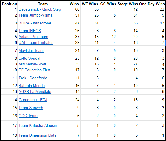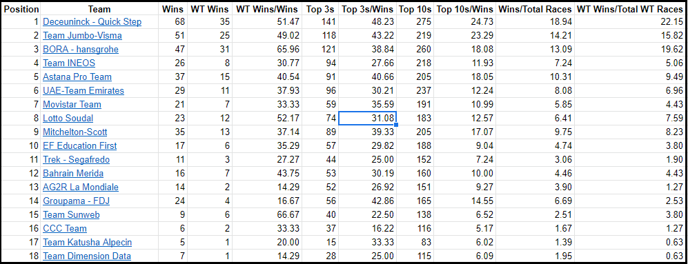 Finally here are a few more nerdy stats that show how likely teams were to convert good positions into wins and who might have consistently missed out. It also shows where teams picked up the majority of their wins. Bora – hansgrohe for example definitely put more onus on the World Tour achieving more than 65% of their wins in the most important races. Again I’ll leave you to dissect the rest of the stats or this piece will end up turning into a novel.