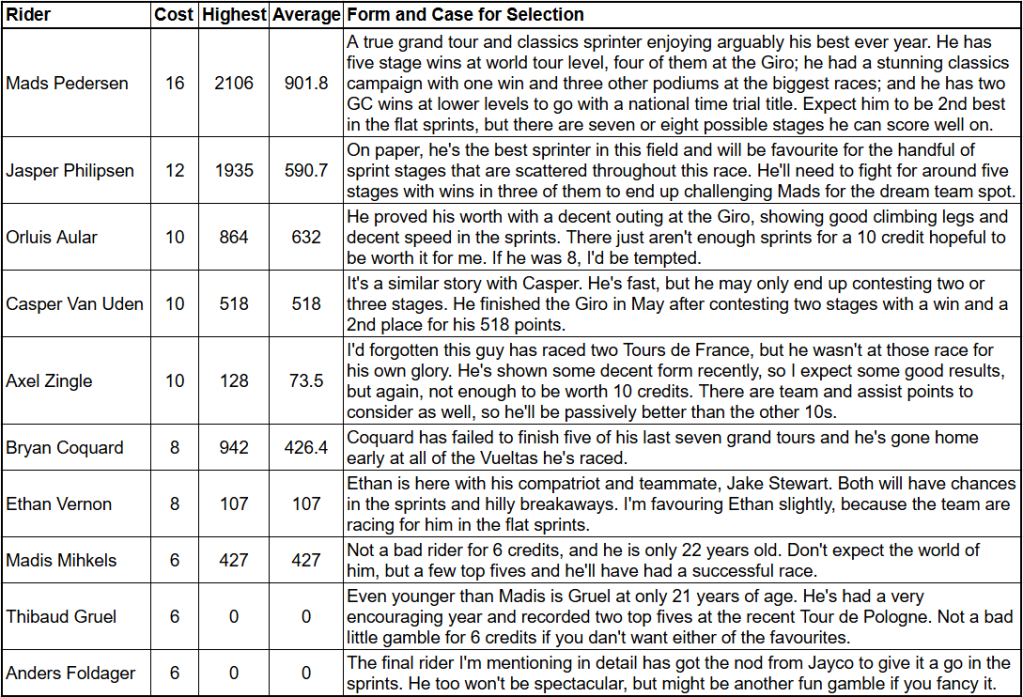 As I said before, I’m taking either Pedersen or Philipsen for my sprinter. Aular, Gruel, and possibly Zingle are all tempting, but the big two are surely hoovering up the majority of the points.